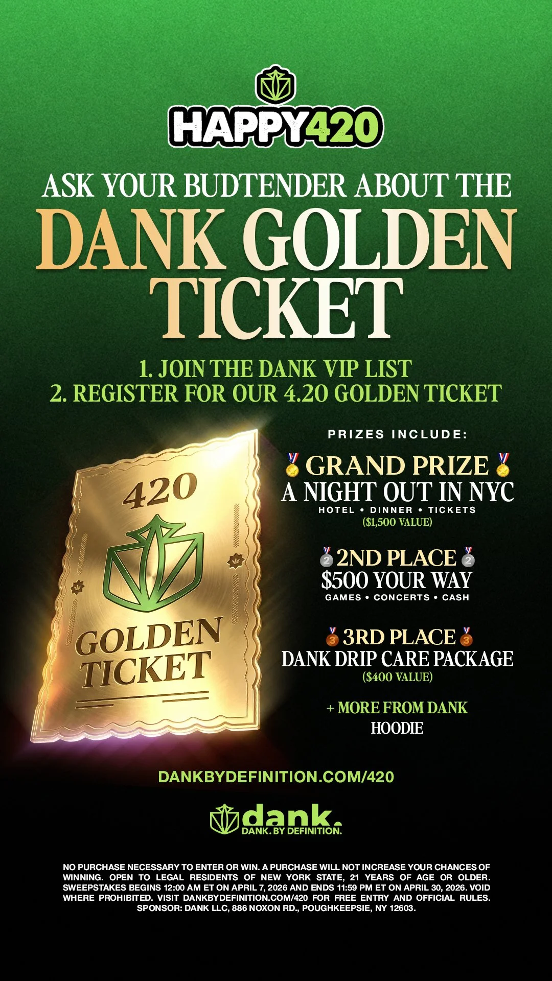 Complete the form below to enter the DANK 4/20 Golden Ticket Giveaway.
